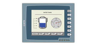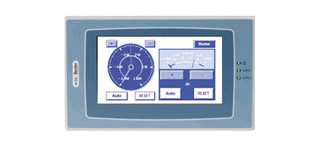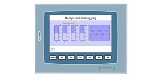 Pantalla táctil gráfica de 7,5" con 256 colores resolución de 640x480 píxeles. Teclado que incluye una tecla de menú y 6 teclas de función. Tres puertos de comunicación RS232, RS422 y RS485. También dispone de 2 puertos USB, 1 puerto de dispositivo USB y por medio de la ranura de tarjetas CF. Permite ampliar el registro y memoria de recetas, copia de seguridad.