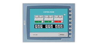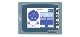 Pantalla táctil gráfica de 7,5" con 256 colores resolución de 640x480 píxeles. Teclado que incluye una tecla de menú y 6 teclas de función. Tres puertos de comunicación RS232, RS422 y RS485. También dispone de 2 puertos USB, 1 puerto de dispositivo USB y por medio de la ranura de tarjetas CF. Permite ampliar el registro y memoria de recetas, copia de seguridad.