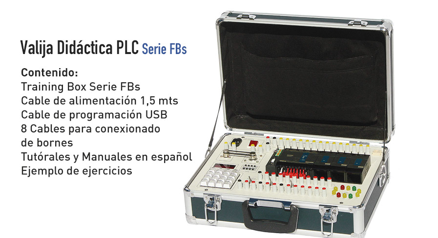 Contiene los elementos básicos requeridos para el entrenamiento en un PLC, resaltando la unidad de alto procesamiento FB-24MCT, el módulo Ethernet FBCM25E, conectores de entradas digitales, interruptores de simulación y conectores de salidas digitales.